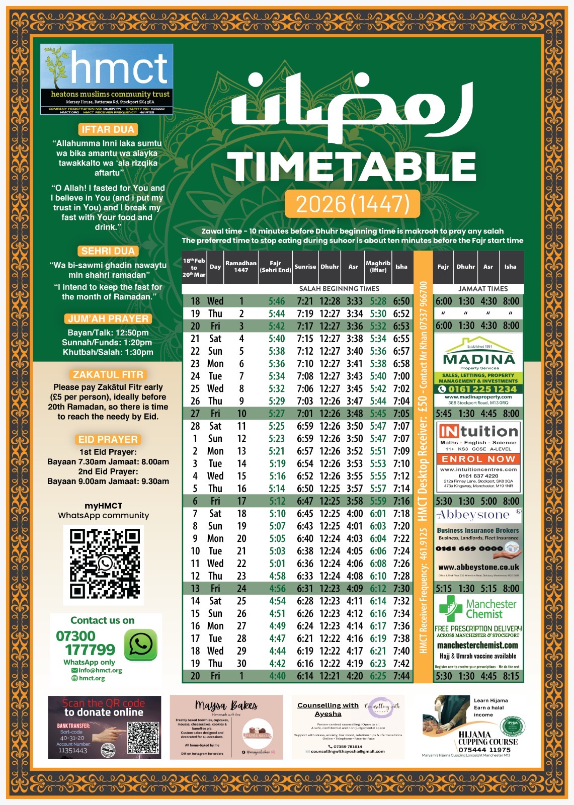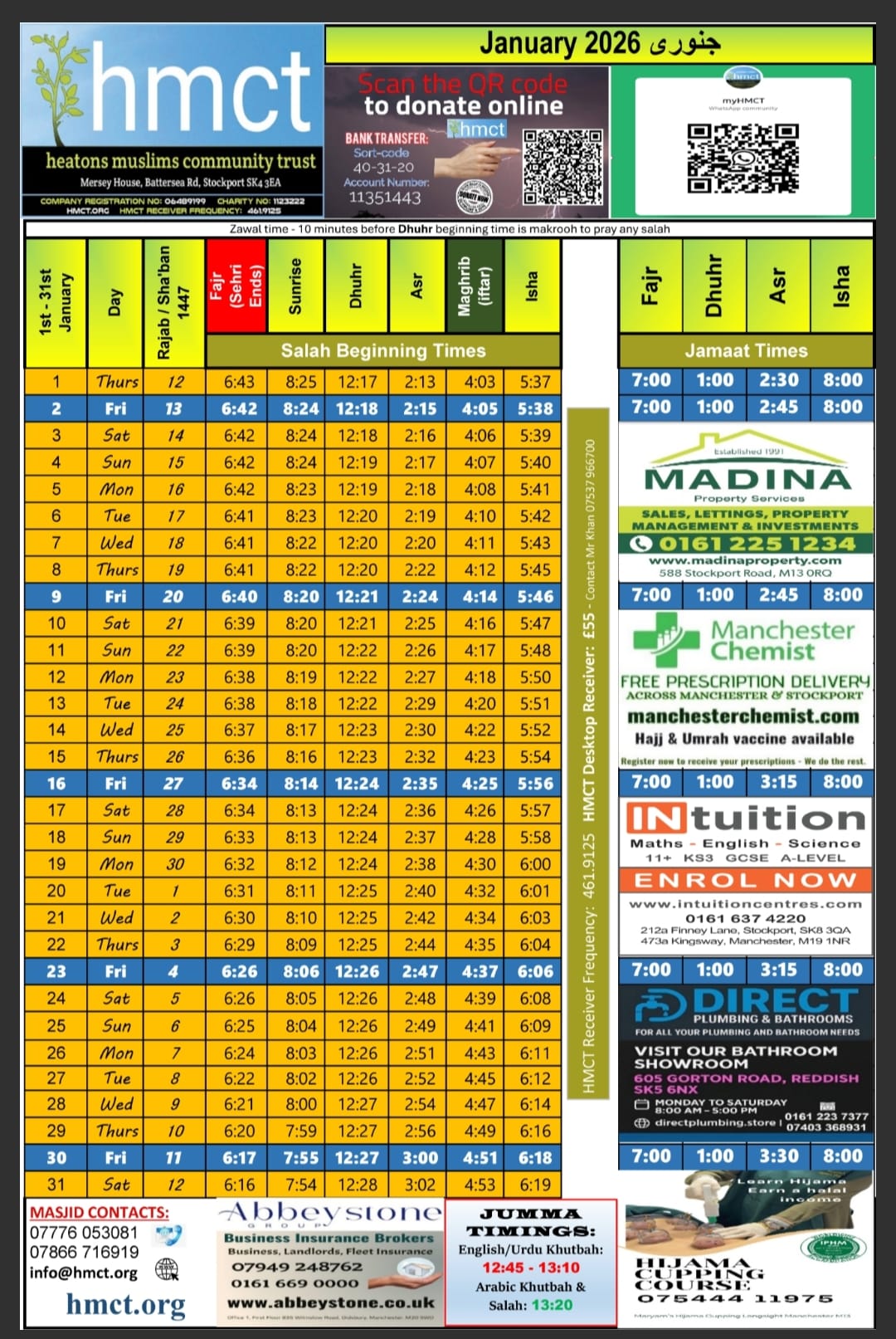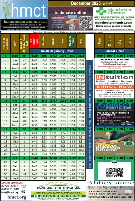 the special prayers for Ramadan and Eid. We hold congregational prayers at specific times, which you can find in our prayer timetable. Facilities There are separate prayer facilities for men and women, men pray in the upstairs hall, and women on the ground floor hall. Live streaming All our congregational prayers, including the Friday sermons, and additional talks from the main prayer hall, are available through special receivers that can be purchased from HMCT.